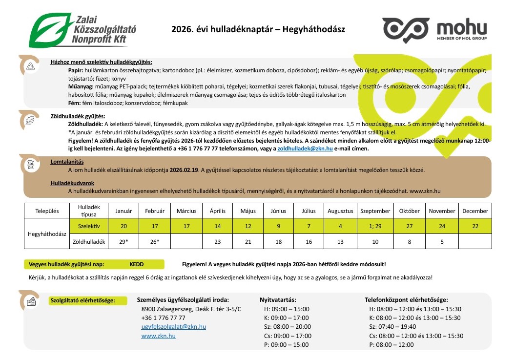 Mellékelve találják a Hegyháthodász településre vonatkozó 2026. évi hulladéknaptárat.