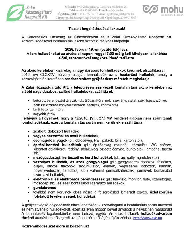 A Zalai Közszolgáltató Kft. Hegyháthodász településen szervezett 2026.02.19-i lomtalanítási akció keretében az alábbi nagy darabos, szilárd hulladékokat szállítja el: